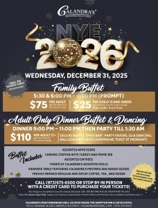 Call (973) 575-6500 for reservations. Private tables or a private room on the mezzanine level are available upon request.